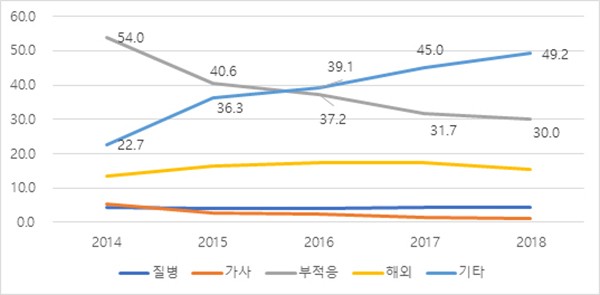 Çб³ ºÎÀûÀÀ¿¡ µû¸¥ ÀÚÅð´Â 2014³â 54.0%¿¡¼ 2018³â 30.0%·Î Ç϶ôÇϰí Àִµ¥, Á¶±âÁøÇÐ, °ËÁ¤°í½Ã µîÀÇ ±âŸ »çÀ¯¿¡ ÇØ´çÇÏ´Â ÀÚÅð´Â 22.7%¿¡¼ 49.2%·Î »ó½ÂÇϰí ÀÖ´Ù.