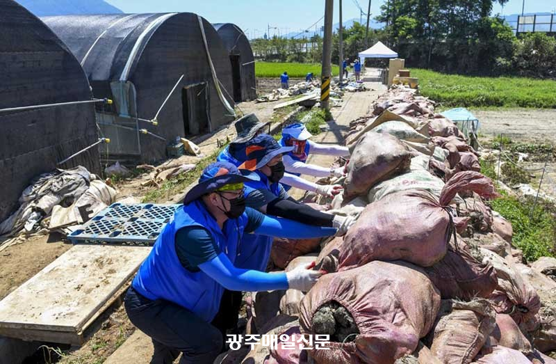 ºÀ»ç´ÜÀº Æø¿ì·Î ħ¼öµÈ Àü´ä°ú ºñ´ÒÇϿ콺, ÁÖÅÿ¡ µé¾î°¡ Åä»ç¿Í °¢Á¾ ¾²·¹±â, ÆóÀÚÀç Á¤¸®, ¼ö·Î º¹±¸ µî ÀÛ¾÷¿¡ ±¸½½¶¡À» Èê·È´Ù.