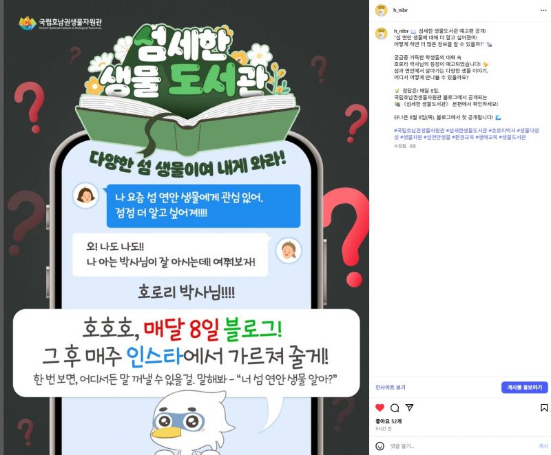 ±¹¸³È£³²±Ç»ý¹°ÀÚ¿ø°üÀº ÃàÀûµÈ ¼¶¡¤¿¬¾È »ý¹°ÀÚ¿ø Á¶»ç¡¤¿¬±¸ Á¤º¸¸¦ ±¹¹Îµé°ú ³ª´©°í °¡Ä¡¸¦ È®»êÇϰíÀÚ ´©¸®¼ÒÅë¸Á(SNS¡¤https://blog.naver.com/h_nibr)¿¡ ¡®¼¶¼¼ÇÑ »ý¹° µµ¼°ü¡¯ Äڳʸ¦ ½Å¼³ÇÏ°í ±¹¹ÎµéÀÌ »ý¹°´Ù¾ç¼º Á¤º¸¸¦ ½±°Ô ÀÌÇØÇÒ ¼ö ÀÖµµ·Ï Ä«µå´º½º ÇüÅ·Π»ý¹° À̾߱⸦ ±¸¼ºÇß´Ù.