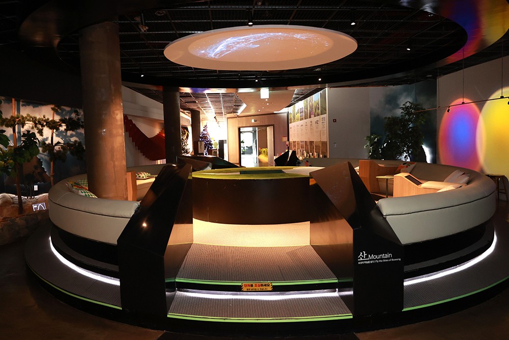 Ä«Æä ³»ºÎ´Â ¡®¹°°á¡¯°ú ¡®¹Ýµ÷ºÒ¡¯À» Çü»óÈÇÑ °íº¸¶óÀÌÆ® Á¶¸íÀ» ¼³Ä¡ÇØ ÀºÀºÇÑ ºûÀ¸·Î ³¶¸¸ÀûÀÎ ºÐÀ§±â¸¦ ¿¬ÃâÇß´Ù. ±âÁ¸ Àü½Ã °ø°£Àº ¡®¿ìÁÖ¡¯¸¦ ¸ðƼºê·Î ÇÑ Á¶¸íÀ¸·Î ²Ù¸çÁ® ÀüÅë°ú ¹Ì·¡°¡ ¾î¿ì·¯Áö´Â Ưº°ÇÑ °ø°£ °æÇèÀ» Á¦°øÇÑ´Ù.<»çÁø>