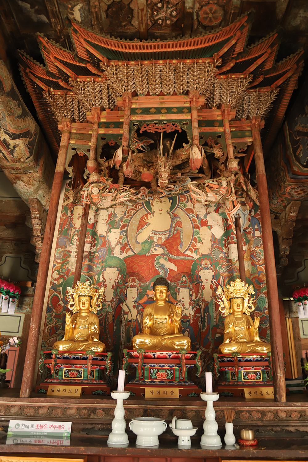 ±Ø¶ôÀü Æí¾×Àº °¢°¢ÀÇ ±ÛÀÚ¸¦ ³ª´©¾î °É¾ú´Âµ¥, ÇϾÓÀÇ ±âº» »À´ë¸¦ ÀÌ·ç´Â ¸ñÀç·Î ÀÎÇØ °ø°£ÀÌ ºÎÁ·Ç߱⠶§¹®À̾úÀ» °ÍÀ̶ó´Â ¼³µµ ÀÖ°í, Æí¾× À§¿¡ ±×·ÁÁø ºÒȸ¦ »ì¸®±â À§Çؼ¿´À» °ÍÀ̶ó´Â ÁÖÀåµµ ÀÖ´Ù. Àü°¢ ¾È¿¡´Â ¾Æ¹ÌŸºÒÀ» Áß½ÉÀ¸·Î °ü¼¼À½º¸»ì°ú ´ë¼¼Áöº¸»ìÀ» ¸ð¼Ì´Ù. ºÒ´Ü À§¿¡´Â ÁöºØ¸ðÇüÀÇ È·ÁÇÑ ´ÝÁýÀÌ ÀÖ°í, ³ªÇѵµ¿Í ÈÁ¶µµ µîÀÇ º®È¿Í ´ÜûÀÌ È»çÇÏ°Ô ±×·ÁÁ® ÀÖ´Ù.