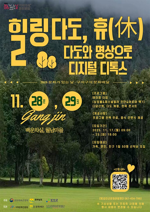 °Áø±ºÀº 19ÀÏ ¡°2025 ¹®È°¡ ÀÖ´Â ³¯ ±¸¼®±¸¼® ¹®È¹è´Þ »ç¾÷ÀÇ ÀÏȯÀ¸·Î ¡®Èú¸µ ´Ùµµ, ÈÞ(ýÌ)¡¯ ÇÁ·Î±×·¥À» ¿À´Â 28Àϰú 29ÀÏ ¹é¿îÂ÷½Ç°ú ¿ù³²¸¶À»¿¡¼ ÁøÇàÇÑ´Ù¡±°í ¹àÇû´Ù.