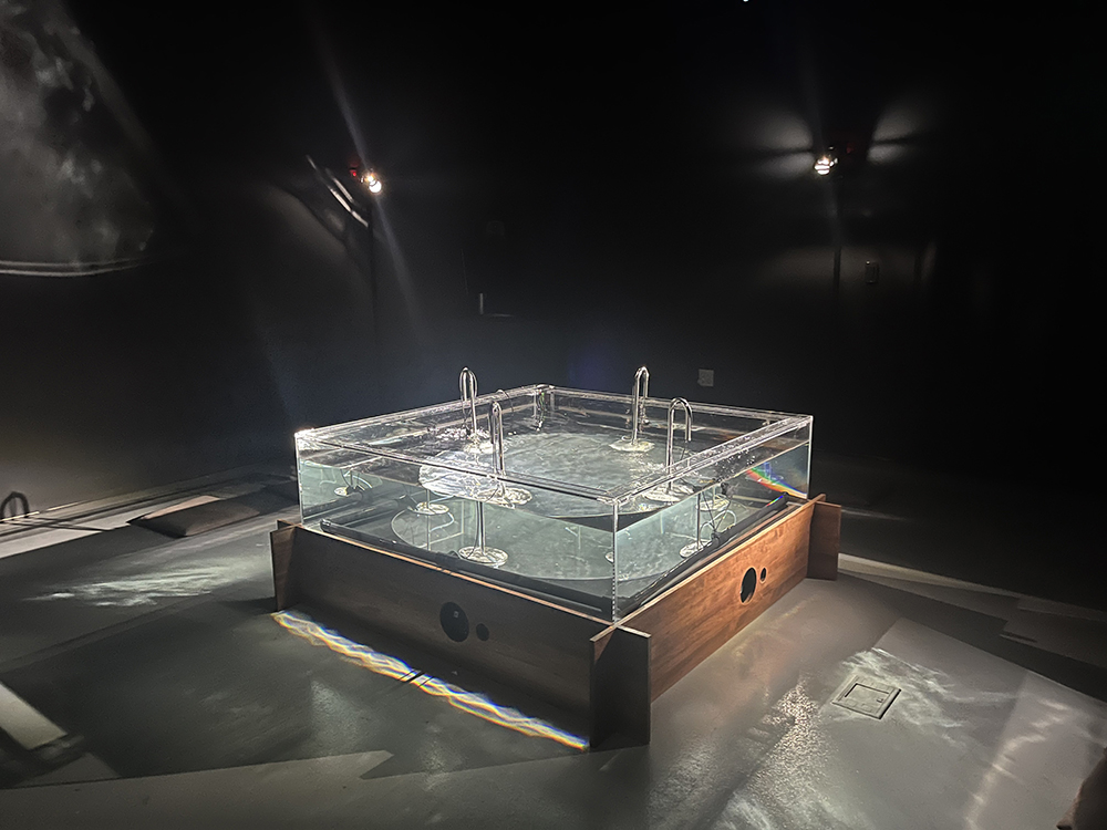¼¶±¤ ÆÀÀº ¡®¹°¡¯°ú ¡®ºû¡¯À» °áÇÕÇÑ ¼³Ä¡ ÀÛ¾÷À» ¼±º¸ÀδÙ. Àü½ÃÀå Áß¾Ó¿¡´Â ¼öÁ¶°¡ ³õ¿© ÀÖ°í, °ü°´Àº ¼öÁß ¸¶ÀÌÅ©¸¦ Á÷Á¢ µé¾î ¿Ã·Á ¹°¼Ó¿¡¼ ¹ß»ýÇÏ´Â ¼Ò¸®¸¦ ½Ç½Ã°£À¸·Î µé¾îº¼ ¼ö ÀÖ´Ù. ¹°¼Ó¿¡¼ ¿ï¸®´Â ¹Ì¼¼ÇÑ ¼Ò¸®¿Í Áøµ¿Àº ½ºÇÇÄ¿¿Í Á¶¸í, ¿µ»óÀ¸·Î È®ÀåµÇ¸ç °ø°£ Àüü¸¦ ä¿î´Ù. °ü°´ÀÌ ÀÛǰ °¡±îÀÌ ´Ù°¡°¥¼ö·Ï ¼Ò¸®¿Í ºûÀÇ ¹ÝÀÀµµ ´Þ¶óÁ®, ¡®µè´Â ÇàÀ§¡¯¿Í ¡®º¸´Â ÇàÀ§¡¯°¡ ÀÚ¿¬½º·´°Ô °ãÃÄÁø´Ù.
