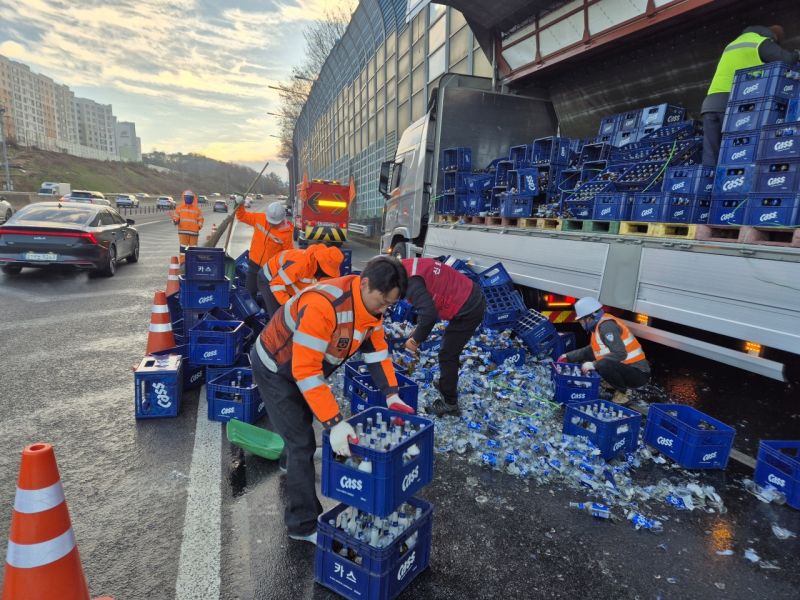 ÀÌ »ç°í·Î ȹ°Â÷¿¡ ÀûÀçµÅ ÀÖ´ø ¸ÆÁÖ 320»óÀÚ°¡ µµ·Î¿¡ ½ñ¾ÆÁ³´Ù. ½ñ¾ÆÁø ¸ÆÁÖº´ÀÌ ¾ó¸¸Áö´Â Á¤È®È÷ Áý°èµÇÁö ¾Ê¾ÒÀ¸³ª ¿î¼Û ±Ô¸ð¸¦ °¨¾ÈÇÏ¸é ¼öõº´¿¡ ´ÞÇÒ °ÍÀ¸·Î Ãß»êµÈ´Ù.