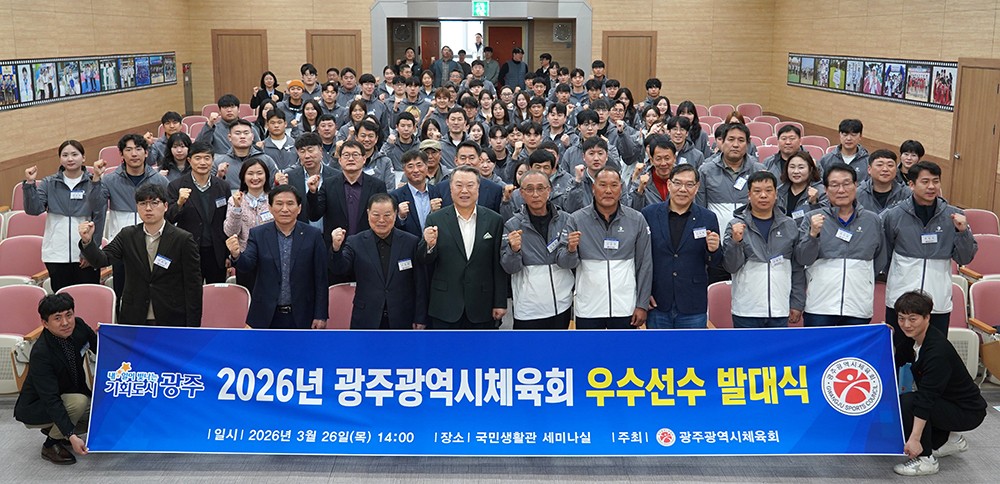 ±¤ÁÖ½ÃüÀ°È¸´Â 26ÀÏ ¿ÀÈÄ 2½Ã ±¹¹Î»ýȰ°ü ¼¼¹Ì³ª½Ç¿¡¼ Àü°©¼ö ±¤ÁÖ½ÃüÀ°È¸Àå, ÀÌÁ¤ÇÏ Àü¹®Ã¼À°À§¿øÀåÀ» ºñ·ÔÇØ ÃÖ¿Ï¿µ(´ç±¸), ¾çÁö¿ø(Çɼö¿µ) µî ¿ì¼ö¼±¼ö 100¿© ¸íÀÌ Âü¼®ÇÑ °¡¿îµ¥ ¡®2026 ±¤ÁÖ½ÃüÀ°È¸ ¿ì¼ö¼±¼ö ¹ß´ë½Ä¡¯À» °³ÃÖÇß´Ù. (»çÁø)
