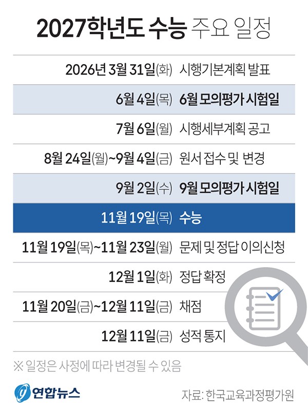 2027Çг⵵ ¼ö´É ½ÃÇà±âº»°èȹÀº Æò°¡¿ø ȨÆäÀÌÁö(kice.re.kr)³ª ¼ö´É ȨÆäÀÌÁö(suneung.re.kr)¿¡¼µµ º¼ ¼ö ÀÖ´Ù./¹Ú¼±¿Á ±âÀÚ¡¤¿¬ÇÕ´º½º