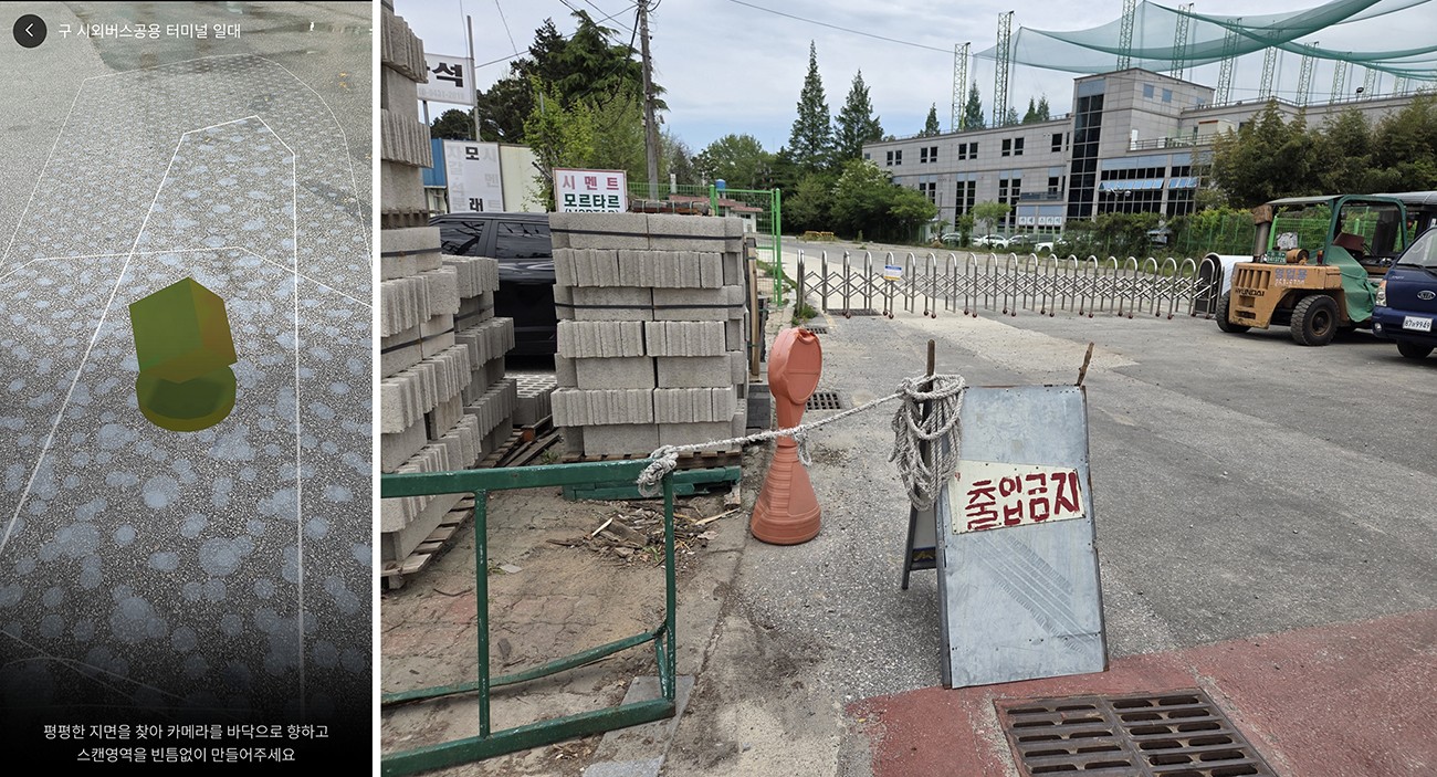 ¾ÛÀ» ½ÇÇàÇØ AR ±â´ÉÀ» Ȱ¼ºÈÇÏÀÚ ¹Ù´ÚÀ» ÀνÄÇ϶ó´Â ¾È³» ¹®±¸¿Í ½ºÄµ ¿µ¿ª Ç¥½Ã, ÃÊ·Ï»ö ÀÔ¹æÃ¼ ÇüÅÂÀÇ ±âÁØÁ¡ÀÌ ³ªÅ¸³µ´Ù.