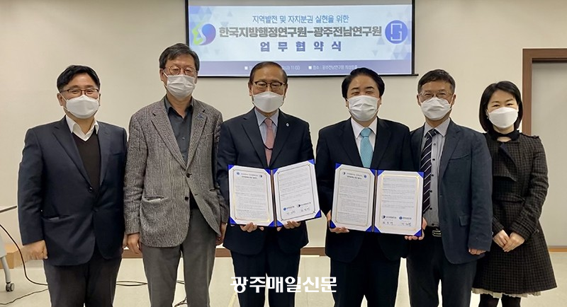 ±¤ÁÖÀü³²¿¬±¸¿øÀÌ Çѱ¹Áö¹æÇàÁ¤¿¬±¸¿ø°ú ÀÚÄ¡ºÐ±Ç¡¤Áö¹æÇàÁ¤ Çõ½Å, Áö¿ª¹ßÀü ¿¬±¸ Çù·ÂÀ» À§ÇÑ ¾çÇØ°¢¼(MOU)¸¦ ü°áÇÏ°í ¿¬±¸±³·ù¿Í »óÈ£Çù·ÂÀ» ÃßÁøÇϱâ·Î Çß´Ù.