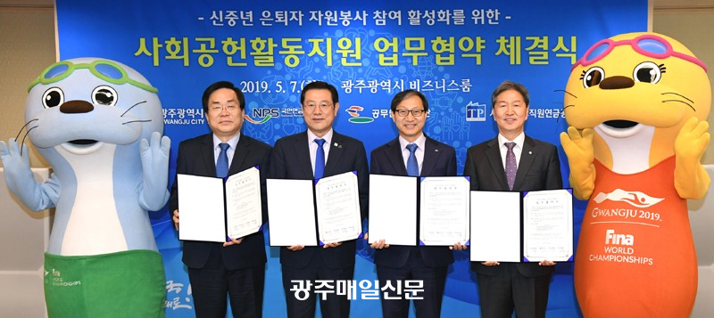 À̿뼷 ±¤ÁÖ½ÃÀåÀÌ 7ÀÏ ¿ÀÈÄ ½Ãû ºñÁî´Ï½º·ë¿¡¼ ½ÅÁß³â ÀºÅðÀÚ ÀÚ¿øºÀ»ç Âü¿© Ȱ¼ºÈ¸¦ À§ÇÑ ¡®»çȸ°øÇåȰµ¿Áö¿ø ¾÷¹«Çù¾à ü°á½Ä¡¯¿¡¼ Çù¾à¼ ¼¸í ÈÄ ±¤ÁÖ¼¼°è¼ö¿µ´ëȸ ¸¶½ºÄÚÆ® ¼ö¸®¡¤´ÞÀÌ¿Í ÇÔ²² ±â³äÃÔ¿µÀ» Çϰí ÀÖ´Ù. /±¤Áֽà Á¦°ø