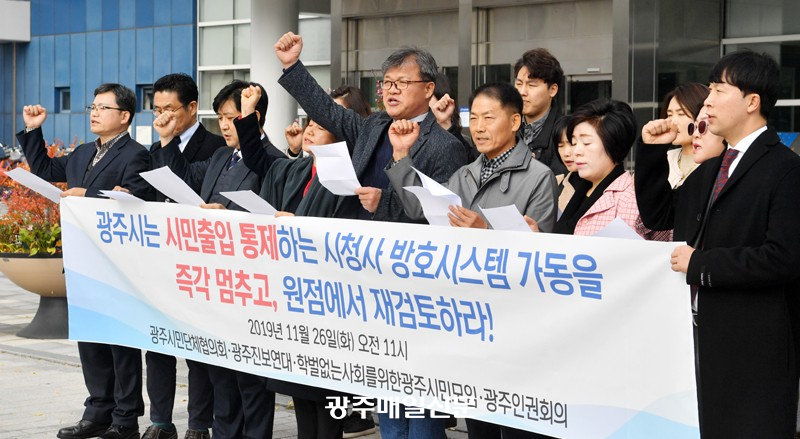 ÃÖ±Ù ±¤ÁÖ½Ãû»ç ¹æÈ£½Ã½ºÅÛ°ú °ü·Ã, ±¤ÁֽùδÜüÇùÀÇȸ¿Í ±¤ÁÖÁøº¸¿¬´ë µî ½Ã¹Î»çȸ´Üü´Â 26ÀÏ ¿ÀÀü ½Ãû¾Õ¿¡¼ ±âÀÚȸ°ßÀ» ¿°í ¡®½Ã¹ÎÃâÀÔ ÅëÁ¦ÇÏ´Â ¹æÈ£½Ã½ºÅÛ ¿øÁ¡ Àç°ËÅ䡯¸¦ ÁÖÀåÇÏ´Â ±¸È£¸¦ ¿ÜÄ¡°í ÀÖ´Ù. /±è¾Ö¸® ±âÀÚ