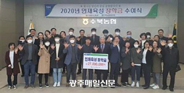 ´ã¾ç ¼öºÏ³ó¾÷Çùµ¿Á¶ÇÕÀº ÃÖ±Ù ³óÇù 2Ãþ ´ëȸÀǽǿ¡¼ ¡®2020³â ÀÎÀçÀ°¼º ÀåÇÐ±Ý ¼ö¿©½Ä¡¯À» °®°í Á¶ÇÕ¿ø µî ÃÑ 27¸í¿¡°Ô °¢°¢ 100¸¸¿ø¾¿ÀÇ ÀåÇбÝÀ» Àü´ÞÇß´Ù.