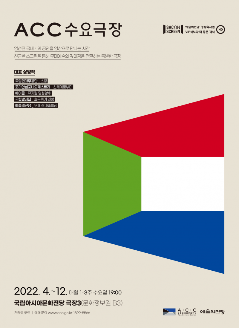 ¡®ACC ¼ö¿ä±ØÀ塯Àº ¿¹¼úÀÇ Àü´ç ¿µ»ó»ç¾÷ ¡®»è ¿Â ½ºÅ©¸°(SAC on Screen)¡¯°ú ¿¬°èÇØ ¿î¿µÇÑ´Ù. ¼öÁØ ³ôÀº °ø¿¬ ¹«´ë¿Í Àü½ÃÀåÀ» ´Ù°¢µµ¿¡¼ ÃÔ¿µ, ÃÖ»óÀÇ ¿µ»ó°ú À½ÇâÀ» ±¸ÇöÇÏ´Â °ø¿¬ ¿µ»óÈ »ç¾÷ÀÌ´Ù.