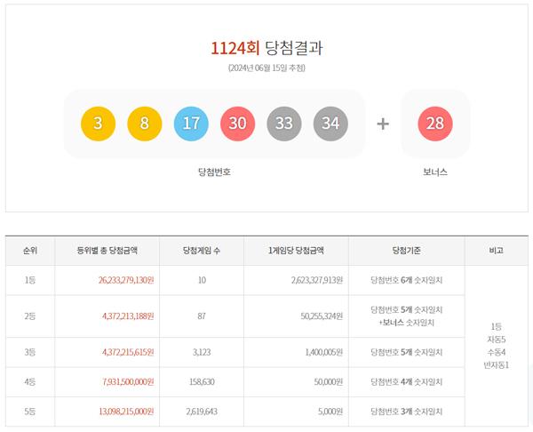 15ÀÏ º¹±Ç¼öŹ»ç¾÷ÀÚ (ÁÖ)µ¿Çູ±Ç Ãø¿¡ µû¸£¸é Á¦ 1124ȸ ·Î¶Ç Ãß÷ °á°ú 1µî ´ç÷¹øÈ£´Â '30, 17, 34, 8, 33, 3', 2µî º¸³Ê½º¹øÈ£´Â '28'¹øÀÌ´Ù.