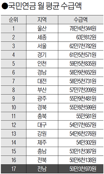 1ÀÎ´ç ±¹¹Î¿¬±Ý ¿ù Æò±Õ ¼ö±Þ¾×ÀÌ °¡Àå ¸¹Àº Áö¿ªÀº ±¤¾ç½Ã(66¸¸2õ292¿ø)·Î ³ªÅ¸³µÀ¸¸ç, ¼øÃµ½Ã(56¸¸3õ264¿ø), ¿©¼ö½Ã(55¸¸3õ602¿ø) µîÀÌ µÚ¸¦ À̾ú´Ù.