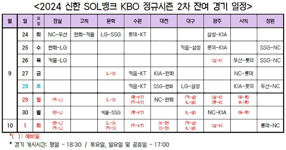 °æ±â°¡ ¿ìõ µîÀ¸·Î Ãë¼ÒµÉ °æ¿ì ¹ßÇ¥µÈ ÀÏÁ¤ÀÇ ¿¹ºñÀÏ·Î ¿ì¼± Æí¼ºµÇ¸ç, ´ÙÀ½ ³¯ µ¿ÀÏ ´ëÁøÀÏ °æ¿ì ´ÙÀ½ ³¯ ´õºíÇì´õ·Î Æí¼ºµÈ´Ù. ¿¹ºñÀÏÀÌ ¾øÀ» °æ¿ì ÃßÈÄ Æí¼ºµÈ´Ù. °æ±â °³½Ã½Ã°£Àº ÆòÀÏ ¿ÀÈÄ 8½Ã30ºÐ, Åä¿äÀÏ ¿ÀÈÄ 5½Ã´Ù. ¶ÇÇÑ 29ÀÏ ¹× 10¿ù1ÀÏÀº À̵¿À» °í·ÁÇØ ¿ÀÈÄ 5½Ã¿¡ Æí¼ºÇÑ´Ù.