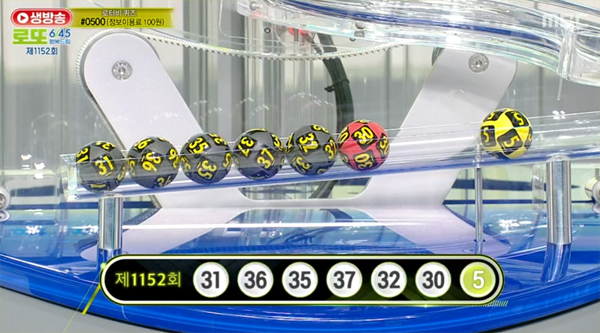 1152ȸ 1µî ´ç÷¹øÈ£ Áß È¦¼ö ¹øÈ£´Â 3°³(31, 35, 37), ¦¼ö ¹øÈ£ 3°³(30, 32, 36)À̸ç, ¹øÈ£ ÃÑÇÕÀº (201)ÀÌ´Ù. ´ç÷¹øÈ£ ±¸°£º°·Î´Â 1 (1 ~ 10)¹ø´ë 0°³, 10 (11 ~ 20)¹ø´ë 0°³, 20 (21 ~ 30)¹ø´ë 0°³, 30 (31 ~ 40)¹ø´ë 6°³, 40 (41 ~ 45)¹ø´ë 0°³ÀÌ´Ù.