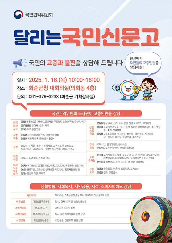 À̹ø Çà»ç´Â ±¹¹Î±ÇÀÍÀ§¿øÈ¸¿Í ´ëÇѹý·ü±¸Á¶°ø´Ü, Çѱ¹¼ÒºñÀÚ¿ø, Çѱ¹±¹ÅäÁ¤º¸Á¤º¸°ø»ç, ¼¹Î±ÝÀ¶ÁøÈï¿ø µî 4°³ Çù·Â ±â°üÀÇ Àü¹®°¡ 20¿©¸íÀÌ Âü¿©ÇØ °ø°ø¼ºñ½º Àü¹Ý¿¡ ´ëÇÑ »ó´ãÀ» ÁøÇàÇÒ ¿¹Á¤À̸ç, ȼø±º°ú ÀÎÁ¢ÇÑ º¸¼º±º Áֹεµ »ó´ã¹ÞÀ» ¼ö ÀÖ´Ù.