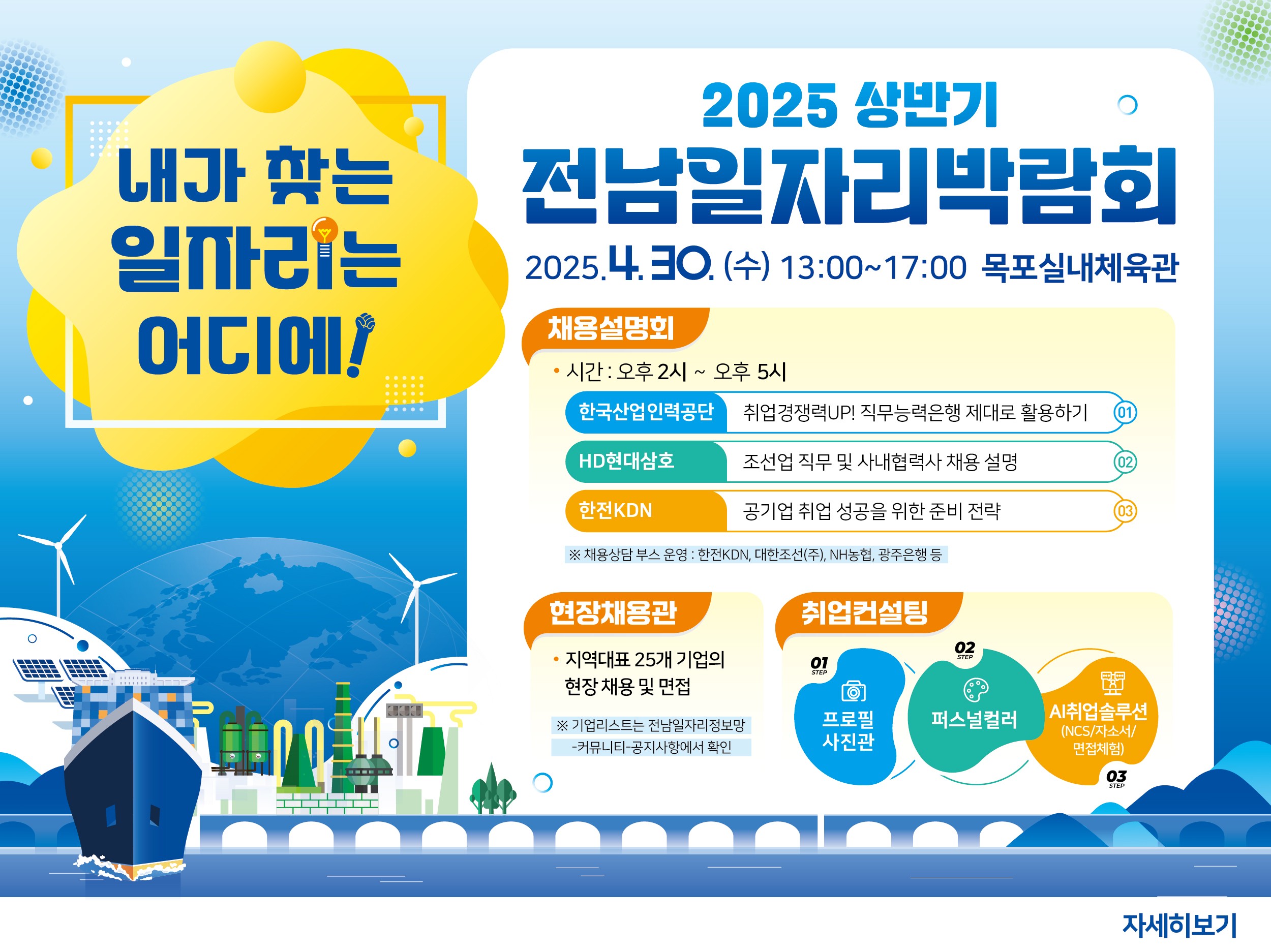 Àü³²µµ°¡ ¿À´Â 30ÀÏ ¸ñÆ÷½Ç³»Ã¼À°°ü¿¡¼ ¡®2025 »ó¹Ý±â Àü³²ÀÏÀÚ¸®¹Ú¶÷ȸ¡¯¸¦ °³ÃÖÇÑ´Ù. Á¶¼±¾÷, ½Äǰ Á¦Á¶¾÷, °ü±¤¼÷¹Ú µî ´Ù¾çÇÑ ºÐ¾ß 28°³ ±â¾÷¿¡¼ 148¸í ä¿ëÀ» ¸ñÇ¥·Î Çϰí ÀÖ´Ù.