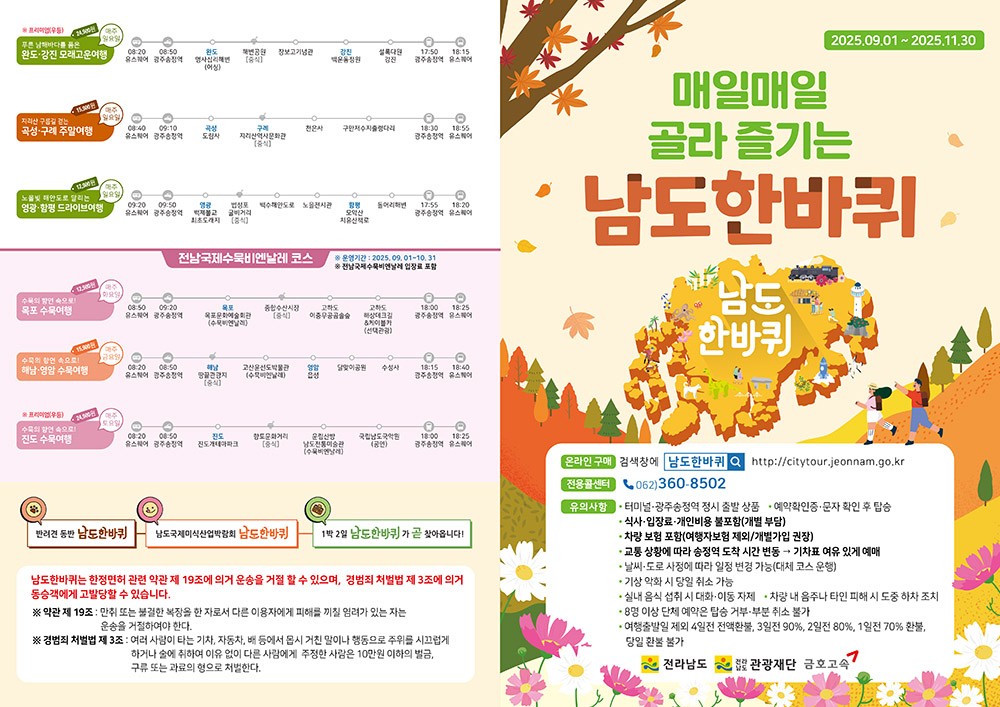 Àü³²ÀÇ ¾Æ¸§´Ù¿î °¡À»À» °æÇèÇÒ ¼ö ÀÖ´Â 21°³ ÄÚ½ºº° ÀÚ¼¼ÇÑ ³»¿ë È®Àΰú ¿¹¾àÀº ³²µµÇѹÙÄû ȨÆäÀÌÁö(http://citytour.jeonnam.go.kr) ¶Ç´Â Àü¿ë Äݼ¾ÅÍ(062-360-8502)¸¦ ÅëÇØ °¡´ÉÇÏ´Ù.