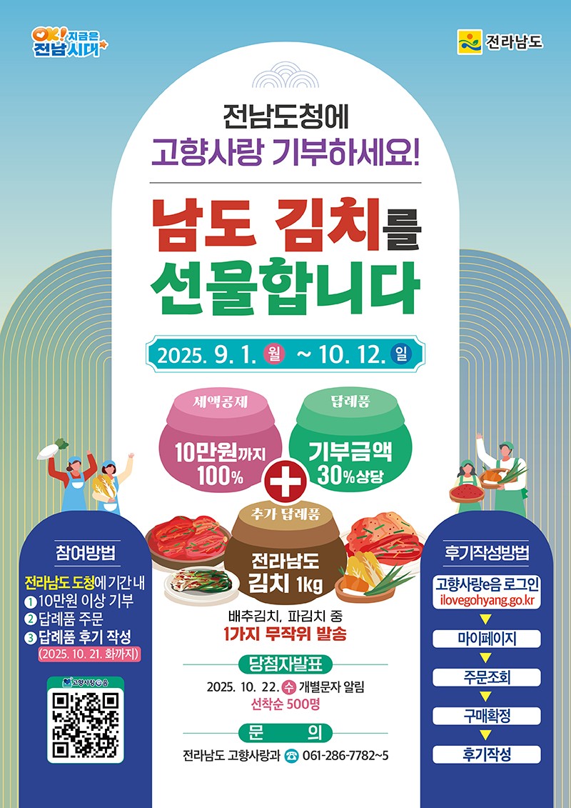 Àü³²µµÃ»¿¡ 10¸¸¿ø ÀÌ»ó ±âºÎÇÏ°í ´ä·Êǰ Èı⸦ ÀÛ¼ºÇÑ ¼±Âø¼ø 500¸í¿¡°Ô ±âÁ¸ ´ä·Êǰ ¿Ü¿¡ ½Ã´Ï¾îŬ·´ ¾î¸£½ÅµéÀÌ Á÷Á¢ ´ã±Ù ¹èÃß±èÄ¡¿Í ÆÄ±èÄ¡ Áß 1°¡Áö ǰ¸ñ(1§¸)À» Ãß°¡ ´ä·ÊǰÀ¸·Î Á¦°øÇÑ´Ù. À̺¥Æ® Âü¿©´Â Àü³²µµÃ»¿¡ 10¸¸¿ø ÀÌ»ó ±âºÎÇÑ ÈÄ °íÇâ»ç¶ûeÀ½¿¡¼ ´ä·ÊǰÀ» ÁÖ¹®¡¤¼ö·ÉÇÑ ´ÙÀ½ Èı⸦ ÀÛ¼ºÇϸé ÀÚµ¿À¸·Î ½ÅûµÈ´Ù. /¾ç½Ã¿ø ±âÀÚ