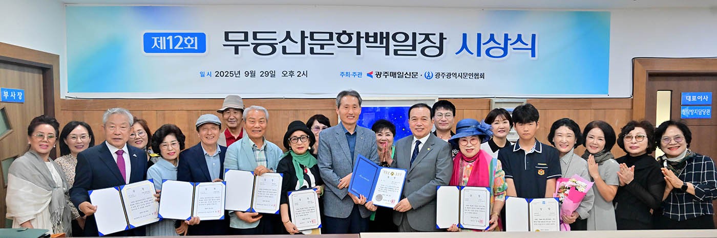 À̰æ¼ö ±¤ÁÖ¸ÅÀϽŹ® ´ëÇ¥ÀÌ»ç´Â ¡°¼ö»óÀÇ ¿µ¿¹¸¦ ¾ÈÀ¸½Å ºÐµé²² ´Ù½Ã Çѹø ÃàÇÏÀÇ ¸»¾¸À» µå¸°´Ù¡±¸ç ¡°¿ÃÇØ·Î 12ȸ¸¦ ¸ÂÀº ¹«µî»ê ¹®ÇÐ ¹éÀÏÀåÀº ±¤ÁÖ¹®ÀÎÇùȸ¿Í ÈûÀ» ¸ðÀ¸¸é¼ ´õ ¸¹Àº ÀÛǰÀÌ Âü¿©Çϰí ÁÁÀº ¼º°ú¸¦ °ÅµÎ°í ÀÖ´Ù¡±°í ÀüÇß´Ù.