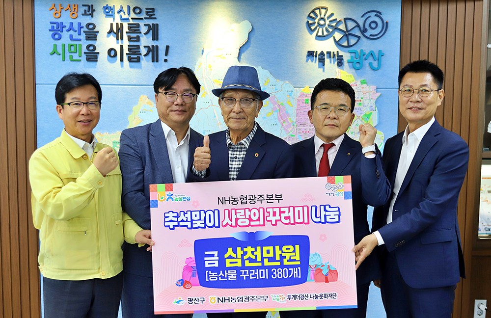 NH³óÇùÀºÇà ±¤ÁÖº»ºÎ´Â 30ÀÏ ¡°Àü³¯ ¹ÎÁ· ´ë¸íÀý Ãß¼®À» ¾ÕµÎ°í ±¤»ê±¸¿¡ °ÅÁÖÇÏ´Â Àú¼Òµæ ¾î¸£½ÅµéÀ» À§ÇØ 3õ¸¸¿ø »ó´çÀÇ Ãß¼®¸ÂÀÌ ³ó»ê¹° ²Ù·¯¹Ì 380¼¼Æ®¸¦ Åõ°Ô´õ±¤»ê ³ª´®¹®ÈÀç´Ü¿¡ ±âºÎÇß´Ù¡±°í ¹àÇû´Ù.