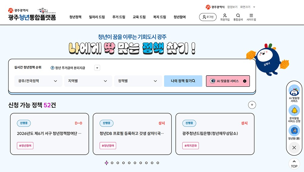 ±¤ÁÖû³âÅëÇÕÇ÷§ÆûÀº ÀÏÀÚ¸®¡¤ÁÖ°Å¡¤±³À°¡¤º¹Áö¹®È µî ´Ù¾çÇÑ Ã»³âÁ¤Ã¥ Á¤º¸¸¦ ÀΰøÁö´É(AI) ¸ÂÃãÇü ¼ºñ½º·Î Á¦°øÇϰí Á¤Ã¥ °Ë»öºÎÅÍ ½Åû±îÁö ¿ø½ºÅéÀ¸·Î °¡´ÉÇϵµ·Ï °³ÆíÇÑ °ÍÀÌ Æ¯Â¡ÀÌ´Ù.