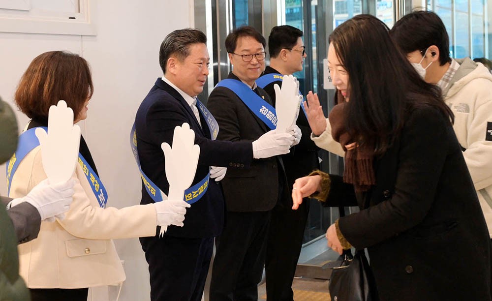 ¼³ ¸íÀýÀ» ¾ÕµÐ 11ÀÏ ±¤ÁÖ ³²±¸Ã»¿¡¼­ û·ÅÇÑ Ãâ±Ù±æ Ä·ÆäÀÎÀÌ ¿­·Á ±èº´³» ³²±¸Ã»ÀåÀ» ºñ·ÔÇÑ °ø¹«¿øµéÀÌ HI-Five ¼ÕÇÇÄÏÀ» µé°í ÀλçÇϰí ÀÖ´Ù.<±¤ÁÖ ³²±¸ Á¦°ø>