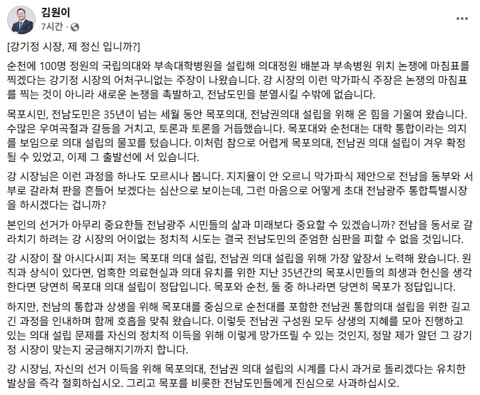 ÀÌ¿¡ ´ëÇØ ±è ÀÇ¿øÀº ¡°¸ñÆ÷½Ã¹Î, Àü³²µµ¹ÎÀº 35³âÀÌ ³Ñ´Â ¼¼¿ù µ¿¾È ¸ñÆ÷ÀÇ´ë, Àü³²±Ç ÀÇ´ë ¼³¸³À» À§ÇØ ¿Â ÈûÀ» ±â¿ï¿©¿Ô°í ¸ñÆ÷´ë¿Í ¼øÃµ´ë´Â ´ëÇÐ ÅëÇÕÀ̶ó´Â ÀÇÁö¸¦ º¸ÀÓÀ¸·Î ÀÇ´ë ¼³¸³ÀÇ ¹°²¿¸¦ ÅÕ´Ù¡±¸ç ¡°Àü³²±Ç ±¸¼º¿ø ¸ðµÎ »ó»ýÀÇ ÁöÇý¸¦ ¸ð¾Æ ÁøÇàÇϰí ÀÖ´Â ÀÇ´ë ¼³¸³ ¹®Á¦¸¦ ÀÚ½ÅÀÇ Á¤Ä¡Àû À̵æÀ» À§ÇØ ÀÌ·¸°Ô ¸Á°¡¶ß¸± ¼ö ÀÖ´Â °ÍÀÎÁö, Á¤¸» Á¦°¡ ¾Ë´ø ±× °±âÁ¤ ½ÃÀåÀÌ ¸Â´ÂÁö ±Ã±ÝÇÏ´Ù¡±°í ÁöÀûÇß´Ù.