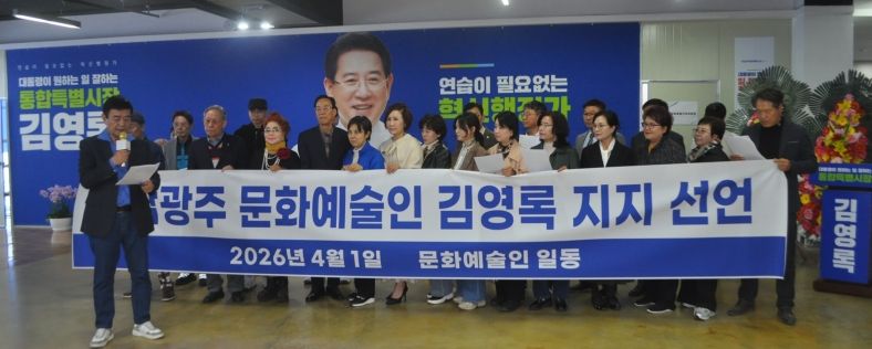 (»ç)±¤ÁÖ¿µÈ­ÀÎÇùȸ Â÷µÎ¿Á ȸÀåÀ» ºñ·ÔÇÑ Áö¿ª ¹®È­¿¹¼úÀÎ 30¿©¸íÀº 2ÀÏ ±¤Áֽà ±¤Ãµµ¿ ¼±°Å»ç¹«½ÇÀ» ã¾Æ ¡°Àü³²¡¤±¤ÁÖ ¹®È­¿¹¼úÀÇ »ýŰ踦 Çõ½ÅÇÒ »ç¶÷Àº ±è¿µ·Ï ¿¹ºñÈĺ¸¡±¶ó¸ç ÀüÆø ÁöÁö¸¦ ¼±¾ðÇß´Ù.