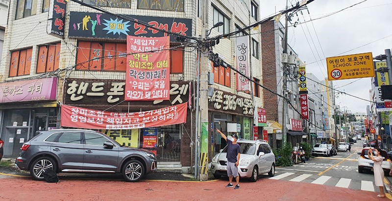 ¡®¼¼ÀÔÀÚ ¹«½ÃÇÏ´Â!! ¾Ç´ö Àå¹ÌÁ¶ÇÕ, ´ë¸² °¢¼ºÇ϶ó!! ¿ì¸®´Â Á×À» °¢¿À°¡ µÅ ÀÖ´Ù!!¡¯, ¡®Àå¹ÌÁ¶ÇÕ, ´ë¸²Àº »ó°¡¼¼ÀÔÀÚ ¿µ¾÷º¸»ó Ã¥ÀÓÁö°í º¸»óÇ϶ó¡¯, ¡®Àå¹Ì¾ÆÆÄÆ®¸¸ ºÎ¼Å¶ó, »ó°¡ÁÖÅÃÀº °³ÀÎÀç»êÀÌ´Ù¡¯¶ó´Â Ç÷¡Ä«µå°¡ °Ç¹° º®¸é °÷°÷¿¡ ºÎÂøµÅ ÀÖ¾ú´Ù.
