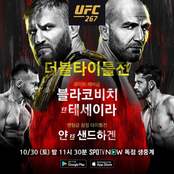 Çѱ¹½Ã°£À¸·Î ¿À´Ã(30ÀÏ Åä¿äÀÏ) UFC 267¿¡¼´Â µÎ ü±Þ ŸÀÌÆ² ¸ÅÄ¡°¡ ÆîÃÄÁø´Ù. UFC ¶óÀÌÆ®Çìºñ±Þ èÇǾð ¾á ºí¶óÄÚºñÄ¡(28-8, Æú¶õµå)°¡ ±Û·Î¹ö Å×¼¼À̶ó(32-7, ºê¶óÁú) »ó´ë·Î 2Â÷ ŸÀÌÆ² ¹æ¾îÀü¿¡ ³ª¼°í, ¹êÅÒ±Þ ÆäÆ®¸£ ¾á(15-2, ·¯½Ã¾Æ)ÀÌ ÄÚ¸® »÷µåÇϰÕ(14-3, ¹Ì±¹)°ú ÀáÁ¤ ŸÀÌÆ²ÀüÀ» Ä¡¸¥´Ù. ¾ÆºÎ´Ùºñ 'UFC ÆÄÀÌÆ® ¾ÆÀÏ·£µå(UFC Fight Island)' ¿¡Æ¼ÇÏµå ¾Æ·¹³ª¿¡¼ ¿¸®´Â 'UFC 267: ºí¶óÄÚºñÄ¡ vs Å×¼¼À̶ó'´Â Çѱ¹½Ã°£À¸·Î ¿À´Ã(30ÀÏ Åä¿äÀÏ) ¹ã 11½Ã 30ºÐ ¾ð´õÄ«µåºÎÅÍ ¸ÞÀÎÄ«µå±îÁö ¸ðµÎ ½ºÆ÷Ã÷ OTT ¼ºñ½º ½ºÆ÷Ƽºñ ³ª¿ì(SPOTV NOW)¿Í ½ºÆ÷Ƽºñ ¿Â(SPOTV ON)À» ÅëÇØ µ¶Á¡ »ýÁß°èµÈ´Ù.