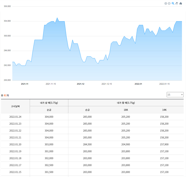 18k¿Í 14k ½Ã¼¼(ÆÈ¶§)´Â °¢ 205,900¿ø°ú 158,700¿øÀ¸·Î Àü °Å·¡Àϰú °°Àº °¡°ÝÀ» º¸À̰í ÀÖ´Ù.