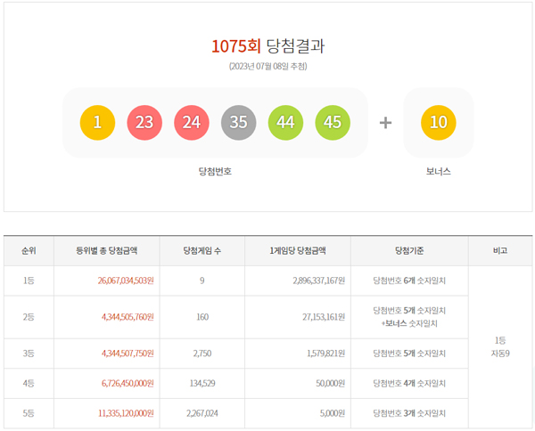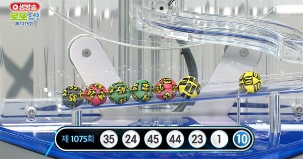 The lottery consignment operator Dong-A Lottery Co., Ltd. revealed on the 8th that as a result of the 1075th lottery lottery, the first prize winning numbers were '35, 24, 45, 44, 23, 1', and the second prize bonus number was '10'.