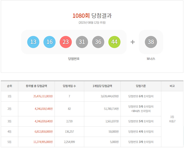 According to the lottery consignment operator Dong-A Lottery Co., Ltd., as a result of the 1080th lottery lottery, the first prize winning numbers were '16, 23, 13, 36, 44, 31', and the second prize bonus number was '38'.