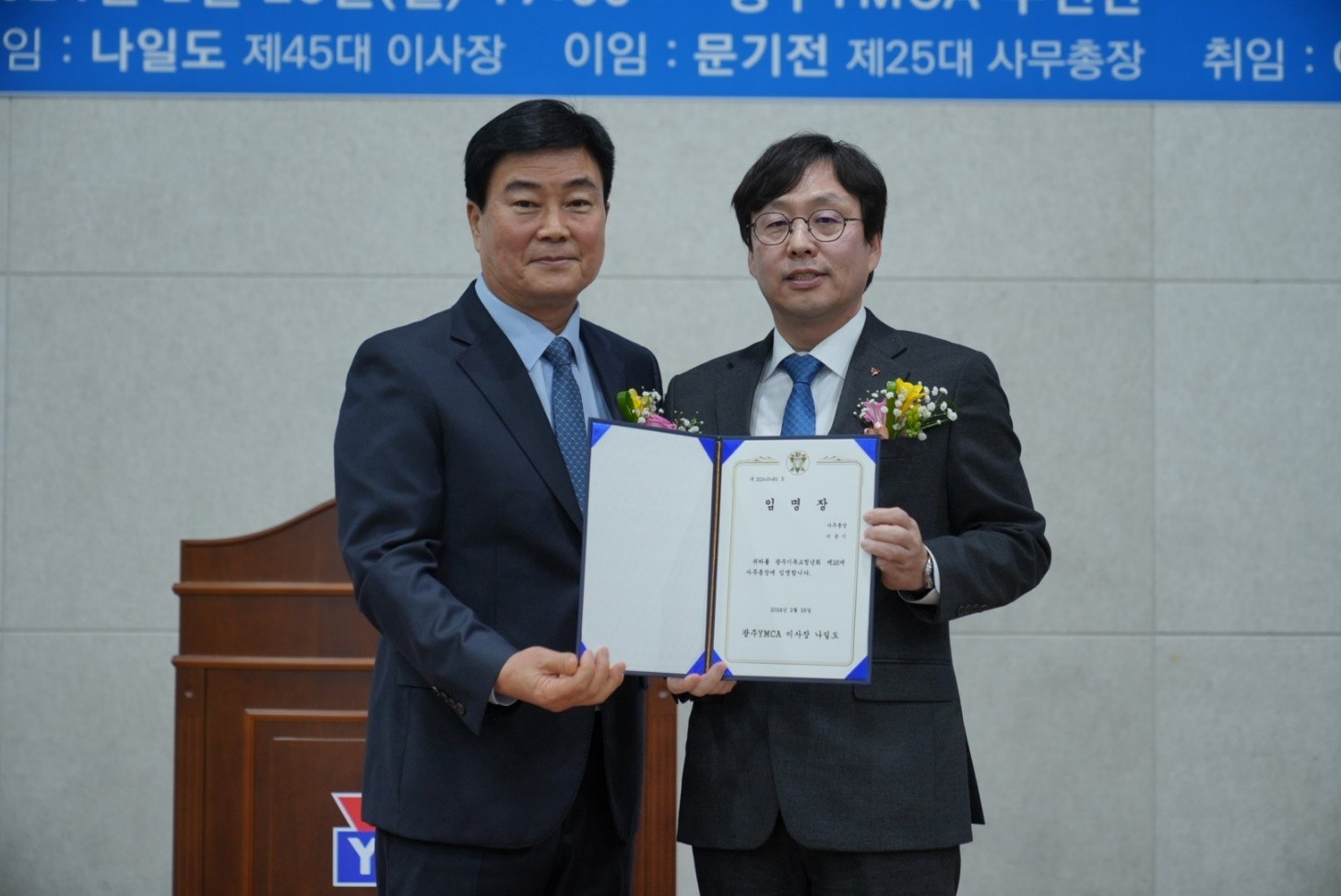Çà»ç´Â ÃÖÇù ±¤ÁÖYMCA Àç´Ü ÀÌ»çÀåÀÇ Àλ縻°ú Á¦44´ë °Çà¿Á ÀÌ»çÀå ÀÌÀÓ½Ä, Á¦25´ë ¹®±âÀü »ç¹«ÃÑÀå ÀÌÀÓ½Ä, Á¦45´ë ³ªÀϵµ ÀÌ»çÀå ÃëÀÓ½Ä, Á¦26´ë ÀÌ¿î±â »ç¹«ÃÑÀå ÃëÀÓ½Ä ¼øÀ¸·Î ÁøÇàµÆ´Ù.