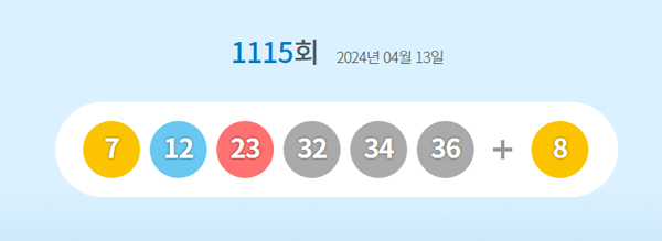 Donghaeng Lottery Co., Ltd., a lottery consignment operator, announced on the 13th that as a result of the 1115th Lotto draw, the first prize winning numbers were '7, 12, 23, 32, 34, 36' and the second prize bonus number was '8'.