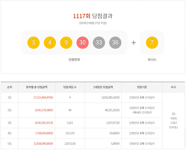 Donghaeng Lottery Co., Ltd., a lottery trustee, announced on the 27th that as a result of the 1117th Lotto draw, the first prize winning numbers were '4, 30, 36, 33, 3, 9' and the second prize bonus number was '7'.