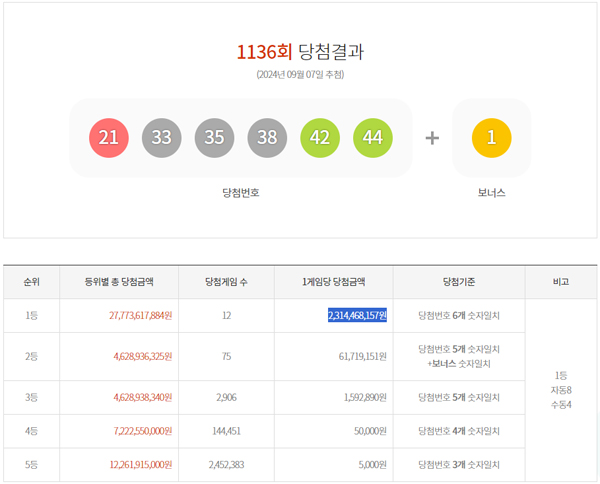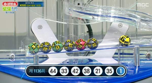 The lottery consignment business operator Donghaeng Lotto Co., Ltd. announced on the 7th that the 1st Prize winning numbers for the 1136th Lotto draw were ¡®44, 33, 42, 38, 21, 35¡¯ and the 2nd Prize Bonus Number was ¡®1¡¯.