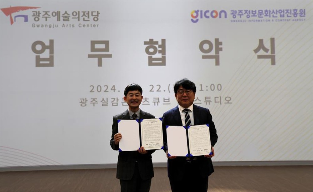 ±¤ÁÖÁ¤º¸¹®È»ê¾÷ÁøÈï¿ø(ÀÌÇÏ GICON)Àº 22ÀÏ ¡°ÁøÈï¿ø ½Ç°¨ÄÜÅÙÃ÷Å¥ºê ½ºÆ©µð¿À¿¡¼ ±¤ÁÖ¿¹¼úÀÇÀü´ç°ú ¡®ÀΰøÁö´É ´ëÇ¥µµ½Ã ±¤ÁÖ¡¯ Á¶¼ºÀ» À§ÇÑ ¾÷¹«Çù¾àÀ» ü°áÇß´Ù¡±°í ¹àÇû´Ù.<»çÁø>