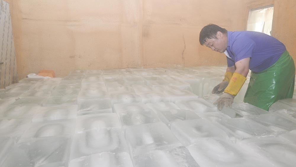 ¿·¿¡¼´Â ¶Ç ´Ù¸¥ ÀÛ¾÷ÀÚ°¡ 1°³ ´ç ¾à 150§¸¿¡ ´ÞÇÏ´Â ¾óÀ½À» Àý´Ü±â ¿·À¸·Î Çϳª¾¿ ¿Å°å´Ù. Ç㸴½ÉÀ» ÀÌ¿ëÇØ ¾óÀ½À» ¹Ð°í, Àý´Ü±â¿¡ ºÙ¿© ³× Á¶°¢À¸·Î Àß¶ó³Â´Ù.