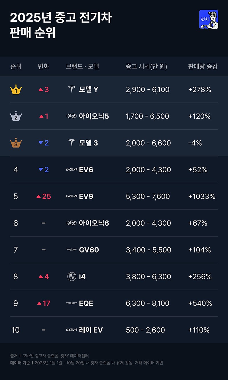 ±¹»ê Àü±âÂ÷ Áß¿¡¼´Â Çö´ë ¾ÆÀÌ¿À´Ð5°¡ 2À§¸¦ ±â·ÏÇϸç Å×½½¶ó ¸ðµ¨ YÀÇ ´ëÇ׸¶·Î ÀÚ¸®Çß´Ù. Àü³â ´ëºñ ¼øÀ§´Â 1´Ü°è Ç϶ôÇßÀ¸³ª, ÆÇ¸Å·®Àº 120% Áõ°¡ÇØ ±¹³» Àü±âÂ÷ ½ÃÀåÀÇ ¾ÈÁ¤Àû ¼ö¿ä¸¦ ÀÔÁõÇß´Ù. µÚÀÌ¾î ±â¾Æ EV6(4À§), EV9(5À§), ¾ÆÀÌ¿À´Ð6(6À§), ·¹ÀÌ EV(10À§)°¡ TOP10¿¡ Æ÷ÇÔµÇ¸ç ±¹»ê Àü±âÂ÷ÀÇ Àúº¯ÀÌ È®ÀåµÇ°í ÀÖ´Â °ÍÀ¸·Î ³ªÅ¸³µ´Ù.