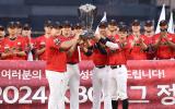 25ÀÏ ±¤ÁÖ-±â¾ÆÃ¨ÇǾð½ºÇʵ忡¼ ¿¸° ·Ôµ¥-KIAÀüÀ» ¾ÕµÎ°í KIA ŸÀ̰ÅÁîÀÇ Á¤±Ô¸®±× ¿ì½Â Æ®·ÎÇÇ ¼ö¿©½ÄÀÌ ¿·È´Ù. »çÁø ¿ÞÂʺÎÅÍ ÀåÇö½Ä°ú ³ª¼º¹ü, À̹üÈ£ °¨µ¶, ¹ÚÂùÈ£°¡ Æ®·ÎÇǸ¦ µé¾îº¸À̰í ÀÖ´Ù./KIAŸÀ̰ÅÁî Á¦°ø
