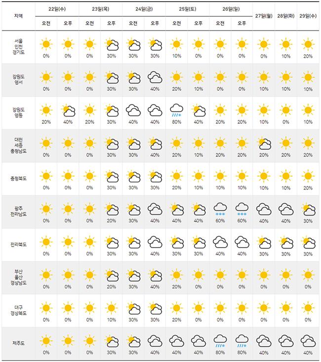 ´ÙÀ½Àº Áö¿ªº° À̹øÁÖ/´ÙÀ½ ÁÖ°£ ³¯¾¾ ¿¹º¸(12¿ù 22ÀÏ ~ 29ÀÏ)ÀÌ´Ù.