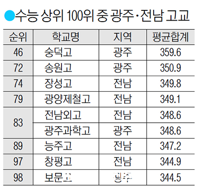 ¸ÕÀú ±¤ÁÖÁö¿ª¿¡¼´Â ÀÚ»ç°íÀÎ ¼þ´ö°í°¡ Àü±¹ »óÀ§ 100À§ Áß 46À§¸¦ Â÷ÁöÇÑ °ÍÀ» ºñ·Ô ¼Û¿ø°í(ÀÚ»ç°í) 72À§, ±¤ÁÖ°úÇаí(Ư¸ñ°í) 83À§, º¸¹®°í(ÀϹݰí) 98À§ ¼øÀ¸·Î ³ªÅ¸³µ´Ù. ¶Ç Àü³²Áö¿ª¿¡¼´Â À强°í(ÀϹݰí)°¡ Àü±¹ »óÀ§ 100À§ Áß 74À§¸¦ ±â·ÏÇѵ¥ ÀÌ¾î ±¤¾çÁ¦Ã¶°í(ÀÚ»ç°í) 79À§, Àü³²¿Ü°í(Ư¸ñ°í) 83À§, ´ÉÁÖ°í(ÀϹݰí) 89À§, âÆò°í(ÀϹݰí) 97À§ ¼øÀÌ´Ù.
