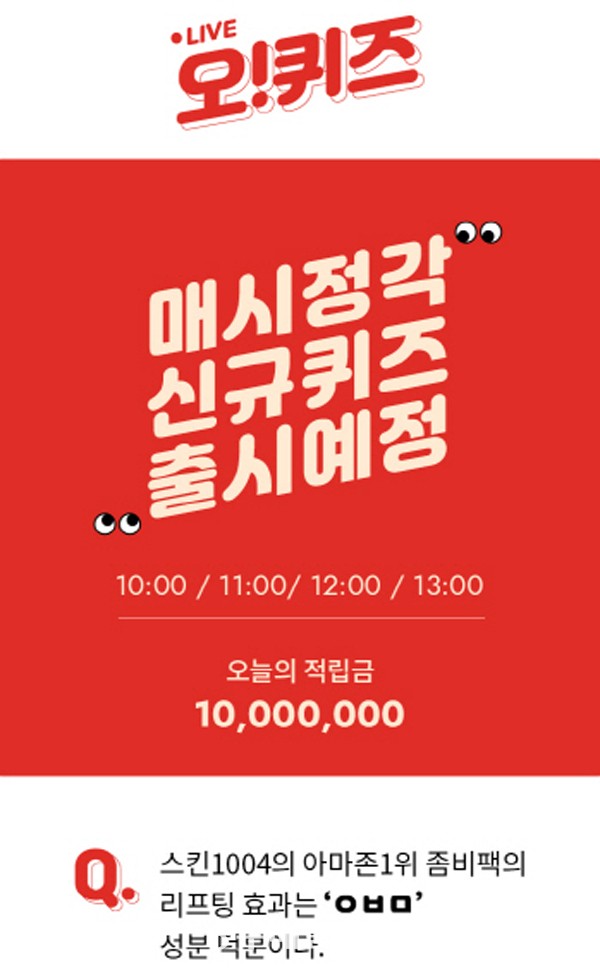 ÃÑ 1,000¸¸ ¿øÀÇ »ó±ÝÀÌ °É¸° À̹ø ¿ÀÄûÁî õ¸¸¿øÀ̺¥Æ®´Â ¸Å ½Ã Á¤°¢¸¶´Ù ¿ÀÈÄ 1½Ã±îÁö »õ·Î¿î ÄûÁ Á¦½ÃÇÑ´Ù.
