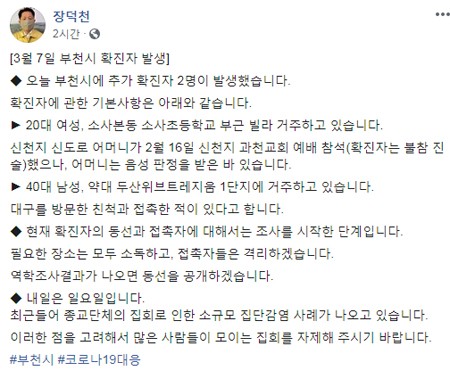 7ÀÏ Àå´öõ ºÎõ½ÃÀåÀº ÀÚ½ÅÀÇ sns¿¡ "¿À´Ã ºÎõ½Ã¿¡ Ãß°¡ È®ÁøÀÚ 2¸íÀÌ ¹ß»ýÇß½À´Ï´Ù"¸ç È®ÁøÀÚ¿¡ °üÇÑ ±âº»»çÇ×À» °ø°³Çß´Ù.